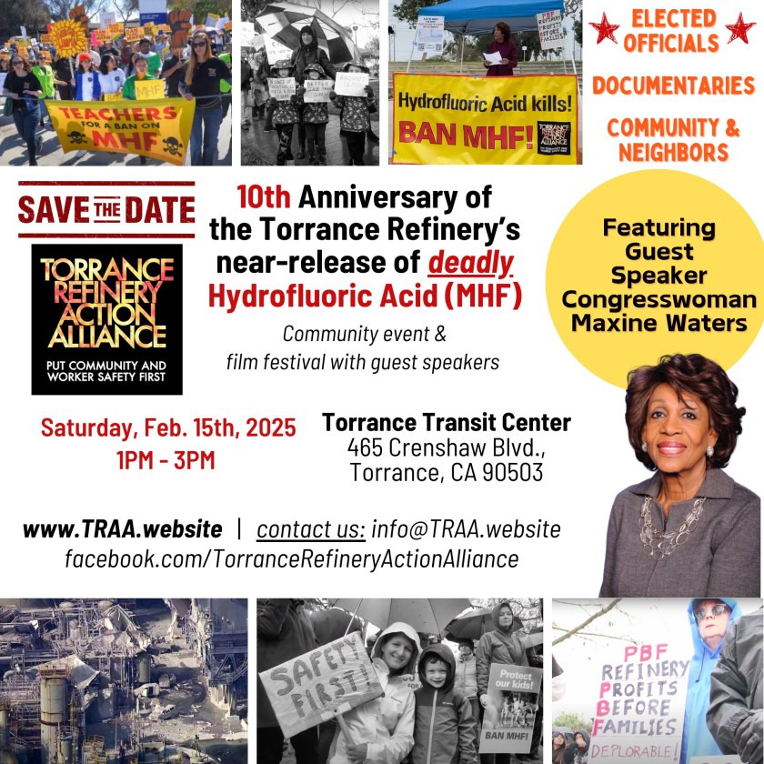 In remembrance to the close call we had with the near-release of deadly HF in the explosion, TRAA is holding a film festival, along with guest speakers on Saturday, Feb 15th 1:00pm – 3:00 at the Torrance Transit Center. All are welcome to come and learn more about the threat.