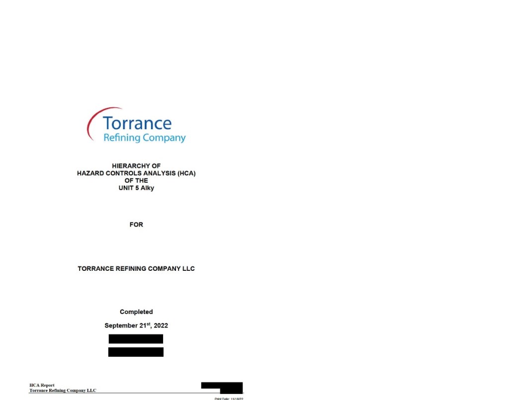 In a little-known regulation established in 2017, refineries that use hydrofluoric acid (HF), an exceptionally dangerous chemical that can cause mass casualties in a few minutes, “are required to conduct a Hierarchy of Hazard Control Analysis (HCA) of its units on a repeating 5-year cycle. A Hazard Control Analysis requires the refinery to enumerate the hazards of each process, and, to assess whether higher order safety measures are feasible” [like using a vastly safer chemical], – a letter from Torrance Refinery-PBF to TRAA, 2018.